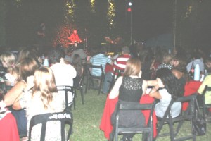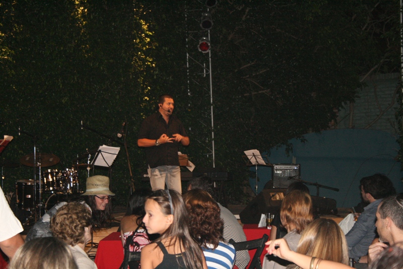 En el patio, mesas con velas y luces tenues dieron el marco perfecto para lo que fue la noche. El escenario, con arboles verdes brillantes, sirvieron de escenografía para la banda y los actores que desde el escenario entretuvieron a las más de 100 personas que agotaron las localidades.
