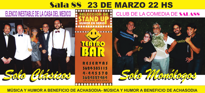 Este fin de semana el teatro bar de Sala 88 se pone solidario ya que será a beneficio de la Asociación Chaqueña de Solidaridad con los Diabéticos (ACHASODIA). Es así que la música de la noche la pondrá el elenco inestable de la Casa del Médico y el humor, como siempre el Club de la Comedia de la cooperativa. Las entradas se pueden reservar al 4445570 –de 18 a 21- o al 362-4383115 –en horario comercial.