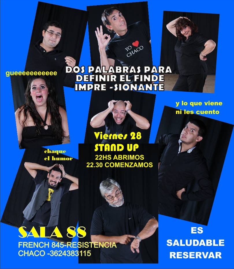 Este viernes Sala 88 vuelve a ofrecer una noche a puro humor con el ya clásico stand up. Será a las 22 y con la modalidad de teatro bar. Las entradas se pueden reservar desde hoy martes al 4445570 o al 3624383115 (en horario comercial).El show de stand up de este fin de semana estará a cargo de los actores del elenco estable de la cooperativa que durante la semana pasada tomaron clases del género humorístico con la estrella cubana Joel Sánchez. Serán de la partida Pazi Morrezi, Ariel Ramírez, Nelson Fernández, Paulo Segobia, Aaron Jerez y Willy Miester. Hugo Blotta será el anfitrión de la noche también haciendo sus monólogos.