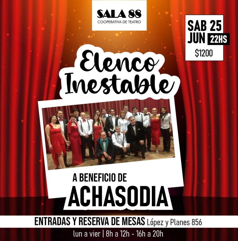 Una vez más Sala 88 se une al elenco Inestable de los Médicos en una causa solidaria. Será a beneficio de la Asociación Chaqueña de Solidaridad con el Diabetico (ACHASODIA). El evento se realizará este sábado 25 de junio a las 21; las entradas se pueden comprar y reservar en López y Planes 856 de lunes a viernes de 8 a 12 y de 16 a 20.