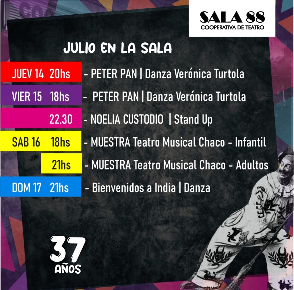 Julio es el mes aniversario de Sala 88 y lo festeja con una cartelera cargada de actividades de diferentes artes escénicas. Esta semana la cartelera comienza el miércoles con teatro, danza, el viernes habrá danza y stand up; el sábado habrá teatro y el domingo danza árabe.