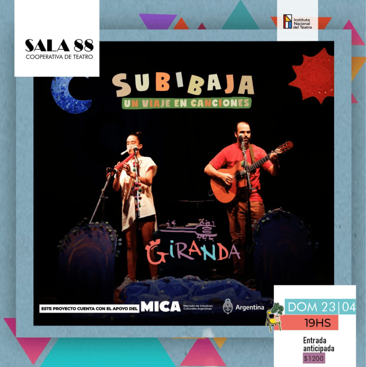 «SubiBaja, un viaje en canciones», es un recorrido musical sonoro que invita a sumergirse en diversos paisajes, historias musicales, juegos corporales que nacen a partir del viaje que realizó el dúo durante el 2019 por distintas provincias argentinas compartiendo sus conciertos y talleres musicales para las infancias. Este espectáculo lúdico musical cuenta con un repertorio de canciones propias y de artistas de la música para infancias que se adentran en los géneros del folclore Latinoamericano como María Elena Walsh, Ana Iniesta, Koufequin, Pim Pau. Guitarra, ukelele, kalimba, tacuaras, llavófono, palo de lluvia, melódica, son algunos de los sonidos que invitan a viajar entre canciones de eco, historias cantadas y juegos de percusión corporal.