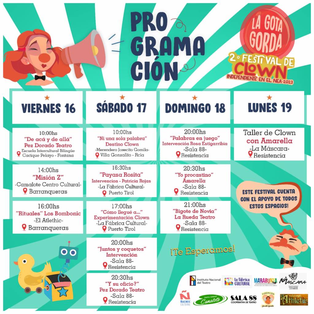 “La Gota Gorda” 2do Festival Independiente de Clown en el NEA tendrá su apertura el viernes 16 de junio en la Escuela Intercultural Bilingüe de Fontana, a las 10 con la obra «De aquí y Allá, homenaje al Circo Criollo». La propuesta continuará en el Centro Cultural “Camalote” de Barranqueras con la obra misionera «Misión Z» del Grupo Fauna Roja. Cerrando la jornada a las 16 con el turno de “Rituales”, una obra del grupo Formoseño Los Bombonic en El Atletic de la misma localidad.