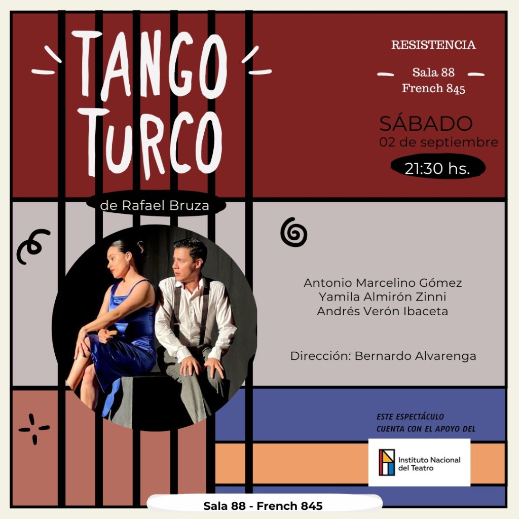 El sábado será el turno de la obra correntina Tango Turno, que cuenta la historia de tres músicos de dudosa categoría inician un recorrido en busca del triunfo, del amor y de la muerte. Prófugos de sus propios fantasmas se adentran en un hilarante periplo intentando ser artistas y fracasando constantemente. En su penoso devenir se plantean si es el arte posible en la adversidad, si el hogar está en algún lugar o si es necesario morir (o matar) por amor. Cómo la letra de un tango…o de una comedia. Actúan Yamila Almirón Zinni, Andrés Verón Ibaceta y Antonio Marcelino Gómez, bajo la dirección de Bernardo Alvarenga.