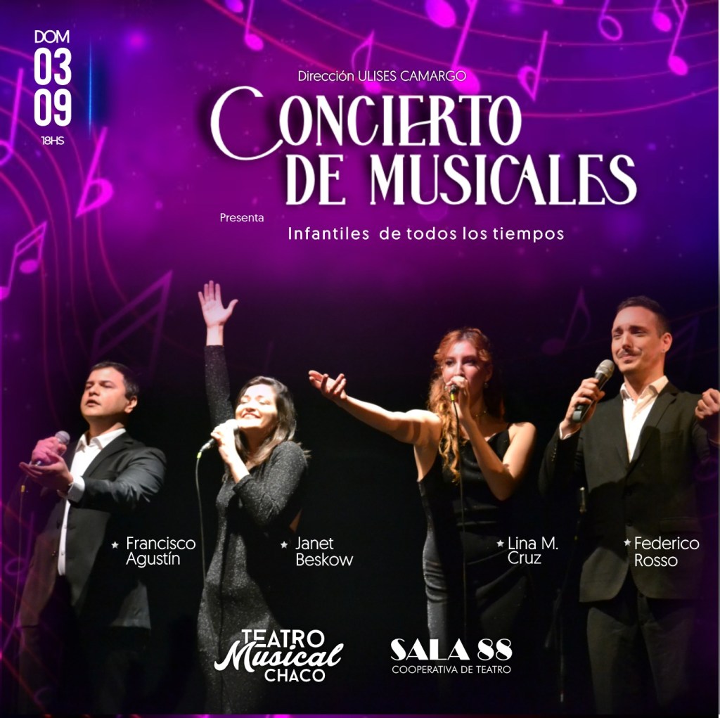 El domingo vuelve la música con los conciertos musicales de Teatro Musical Chaco con la segunda función del espectáculo en el que excelentes cantantes interpretarán los grandes clásicos del musical infantil mundial». El repertorio incluye grandes clásicos del cine y el teatro musical como La Bella Y La Bestia, Aladín, La Sirenita, Encanto, El Rey León, Shrek y Enredados. El elenco está integrado por Lina M. Cruz, Federico Rosso, Janet Beskow, Francisco Agustín, Verónica Vasco y Juliana Stella. La dirección general es de Ulises Camargo.