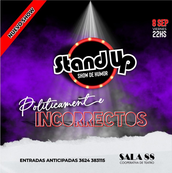 Este viernes vuelve el humor a Sala 88 con show estreno del Stand Up de la Sala con Políticamente Incorrecto. Será a las 22 en las instalaciones de la cooperativa French 845; las entradas anticipadas se pueden comprar al 3624383115.