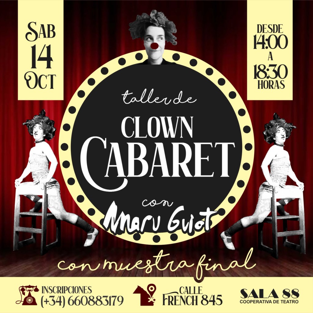 Se realizará en Sala 88 un taller de Clown Cabaret, con Maru Guiot. Será el 14 de octubre, en las instalaciones de la cooperativa. Las consultas e inscripciones se realizan al +34 660 88 31 79.