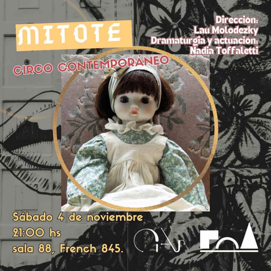 Mitote es una obra de circo contemporáneo. El mitote para los Toltecas es un virus de mil voces que hablan al mismo tiempo en la mente. Chismes, convicciones sociales, habladurías, estereotipos hegemónicos femeninos. La pieza tiene 20 minutos de duración y el equipo de la puesta está integrado por dramaturgia y actuación, Nadia Toffaletti; dirección, Laura Molodezky y maquillaje, Nur Goitia.