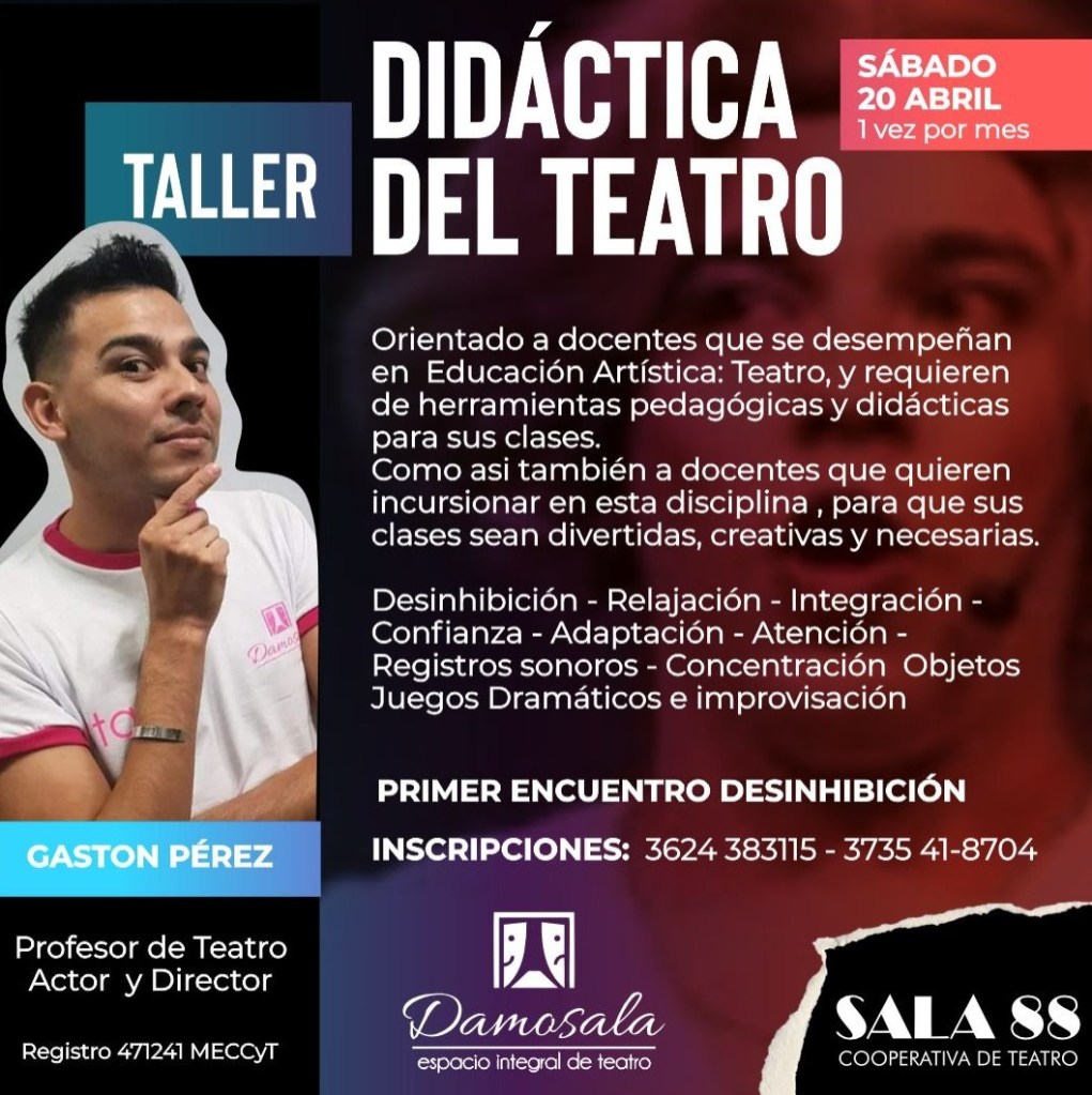 Se realizará en Sala 88 el taller Didáctica del teatro dictada por el profesor Gastón Pérez. Las clases se desarrollarán una vez por mes, a partir del 20 de abril, en las instalaciones de la cooperativa French 845. Para consultas e inscripción se pueden comunicar al 3624383115 o al 3735418704.
