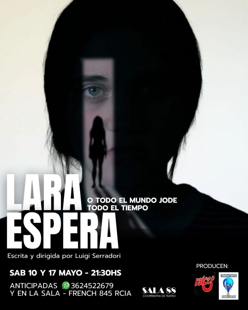 Este sábado 10 de mayo a las 21:30 llega a Sala 88 Lara Espera, o todo el mundo jode todo el tiempo, de Luigi Serradori. La obra se volverá a repetir el sábado 17. Las entradas anticipadas se pueden comprar al 3624383115, al 362452-2679 o en la boletería de la Sala.