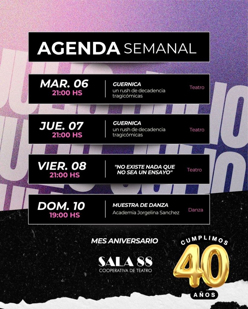 Julio será un mes con muchas actividades Sala 88 ya que es su mes aniversario. Este martes y jueves serán las muestras de mitad de año de los talleres de adultos del grupo de Conexiones. El viernes y sábado habrá funciones del grupo Jopara. Las funciones son en las instalaciones de la cooperativa, French 845; entradas se pueden reservar al 3624000385.
