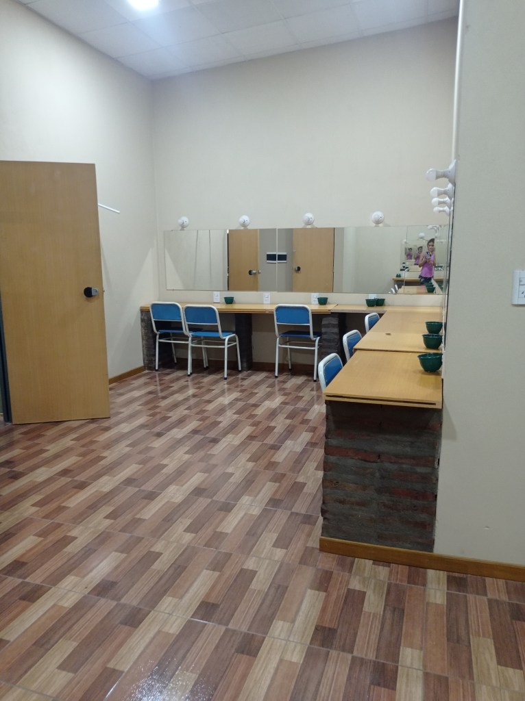 sala de 27,50 x 10 m – escenario de 10,30 m. de proscenio por 1,80 m de profundidad. Capacidad para 300 sillas platea italiana, 110 con sillas y mesas.